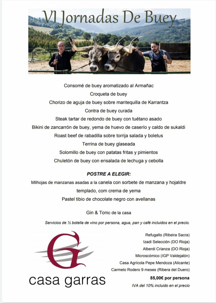 A partir del 17 de Septiembre 2020 hasta Enero 2021 disfruta de las VI Jornadas de Buey Casa Garras: un menú tan único como excepcional, servido a base de carne de buey auténtica (de ejemplares criados en la ganadería familiar). Sólo bajo reserva en el 946806280, PARA UN MÍNIMO DE 2 PERSONAS y servido a mesa completa (salvo excepciones). No dejes pasar la oportunidad de disfrutar de este festival para paladares carnívoros…